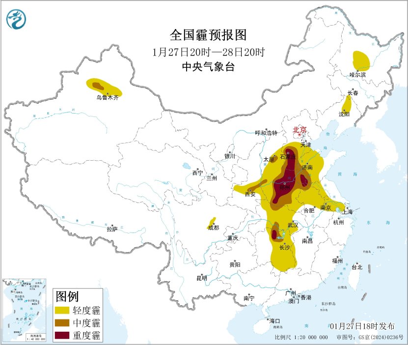 中央氣象臺:華北中南部黃淮江漢等地有霧霾