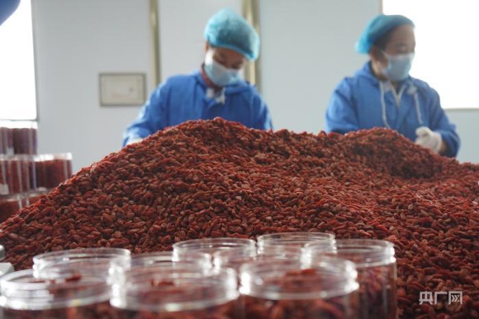 企業(yè)生產車間內,鮮紅的枸杞正在打包裝箱(央廣網(wǎng)記者 汪曉青 攝)