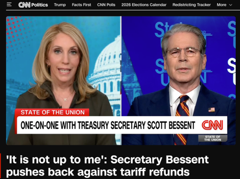 還有一個更現(xiàn)實的“回避點”:貝森特在鏡頭前把退款說成“不是關鍵問題”,這其實是在把政治風險與財政風險同時后推。因為一旦承認“應該退”,接下來就會面臨三個更尖銳的問題:退給誰?退多少(含不含利息)?退款的錢從哪里出?這些都不是一句“等法院”就可以遮過去的。當天,多家媒體引述貝森特接受采訪時的表述,稱“退款由下級法院處理”,這與其說是法律判斷,不如說是政治姿態(tài),即在不承諾的前提下,把主動權留給時間。