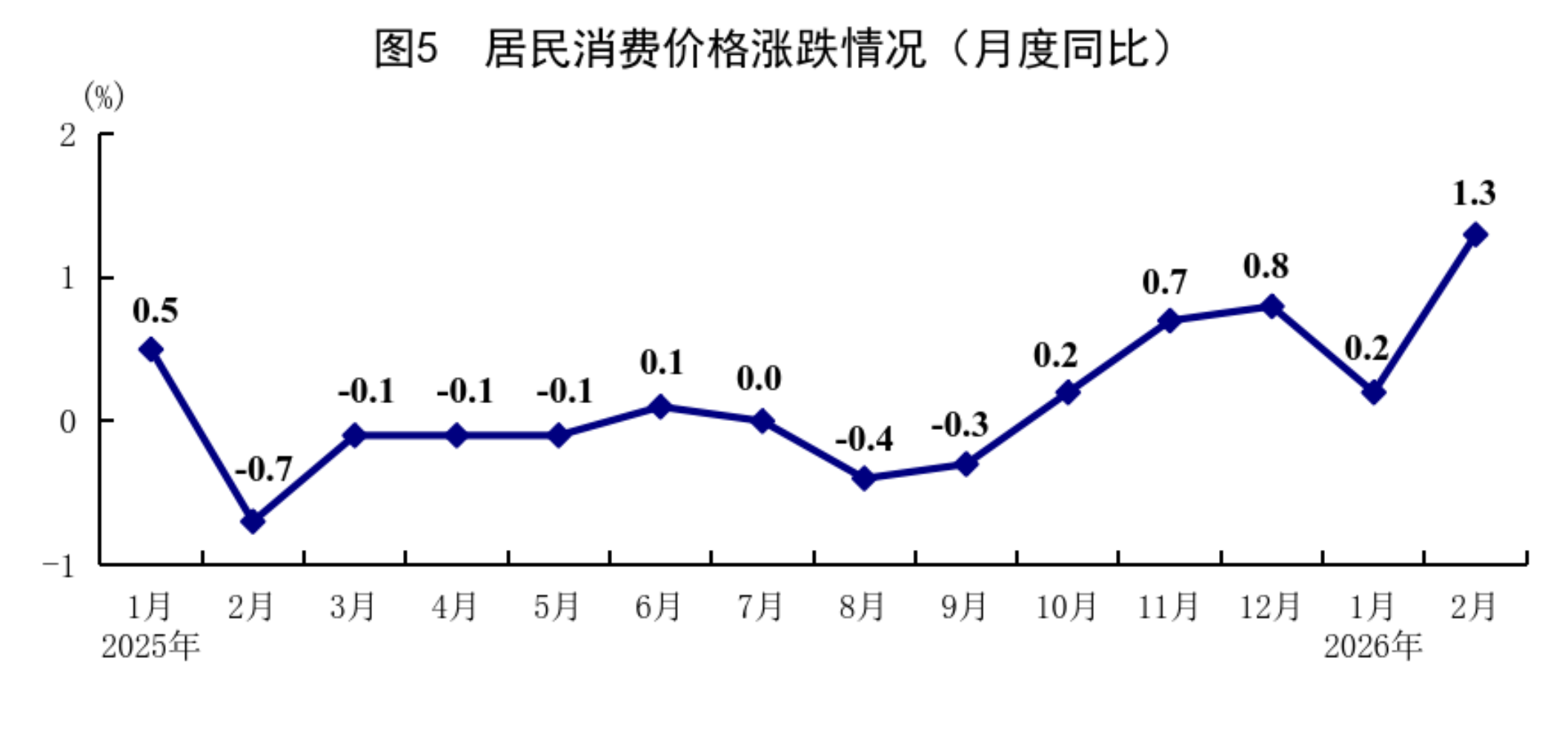1—2月份,全國居民消費價格(CPI)同比上漲0.8%,其中1月份上漲0.2%,2月份上漲1.3%。分類別看,1—2月份,食品煙酒及在外餐飲價格同比上漲0.6%,衣著價格上漲1.9%,居住價格下降0.1%,生活用品及服務(wù)價格上漲2.7%,交通通信價格下降2.1%,教育文化娛樂價格上漲1.0%,醫(yī)療保健價格上漲1.8%,其他用品及服務(wù)價格上漲14.3%。在食品煙酒及在外餐飲價格中,豬肉價格下降11.2%,糧食價格下降0.2%,鮮果價格上漲4.5%,鮮菜價格上漲8.8%??鄢称泛湍茉磧r格后的核心CPI同比上漲1.3%。從環(huán)比看,1月份,全國居民消費價格上漲0.2%,2月份上漲1.0%。