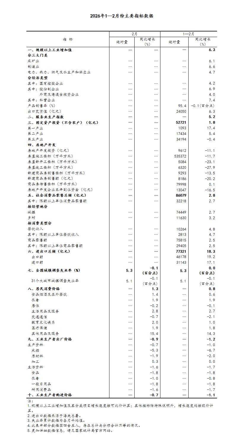 中國網(wǎng)3月16日訊 國家統(tǒng)計局網(wǎng)站3月16日發(fā)布消息,1—2月份,在以習(xí)近平同志為核心的黨中央堅強(qiáng)領(lǐng)導(dǎo)下,各地區(qū)各部門認(rèn)真落實黨中央、國務(wù)院決策部署,堅持穩(wěn)中求進(jìn)工作總基調(diào),實施更加積極有為的宏觀政策,加大逆周期和跨周期調(diào)節(jié),持續(xù)擴(kuò)大內(nèi)需、優(yōu)化供給,做優(yōu)增量、盤活存量,生產(chǎn)供給增長加快,市場需求穩(wěn)中有升,就業(yè)物價總體穩(wěn)定,新質(zhì)生產(chǎn)力成長壯大,經(jīng)濟(jì)運行起步有力,實現(xiàn)良好開局。