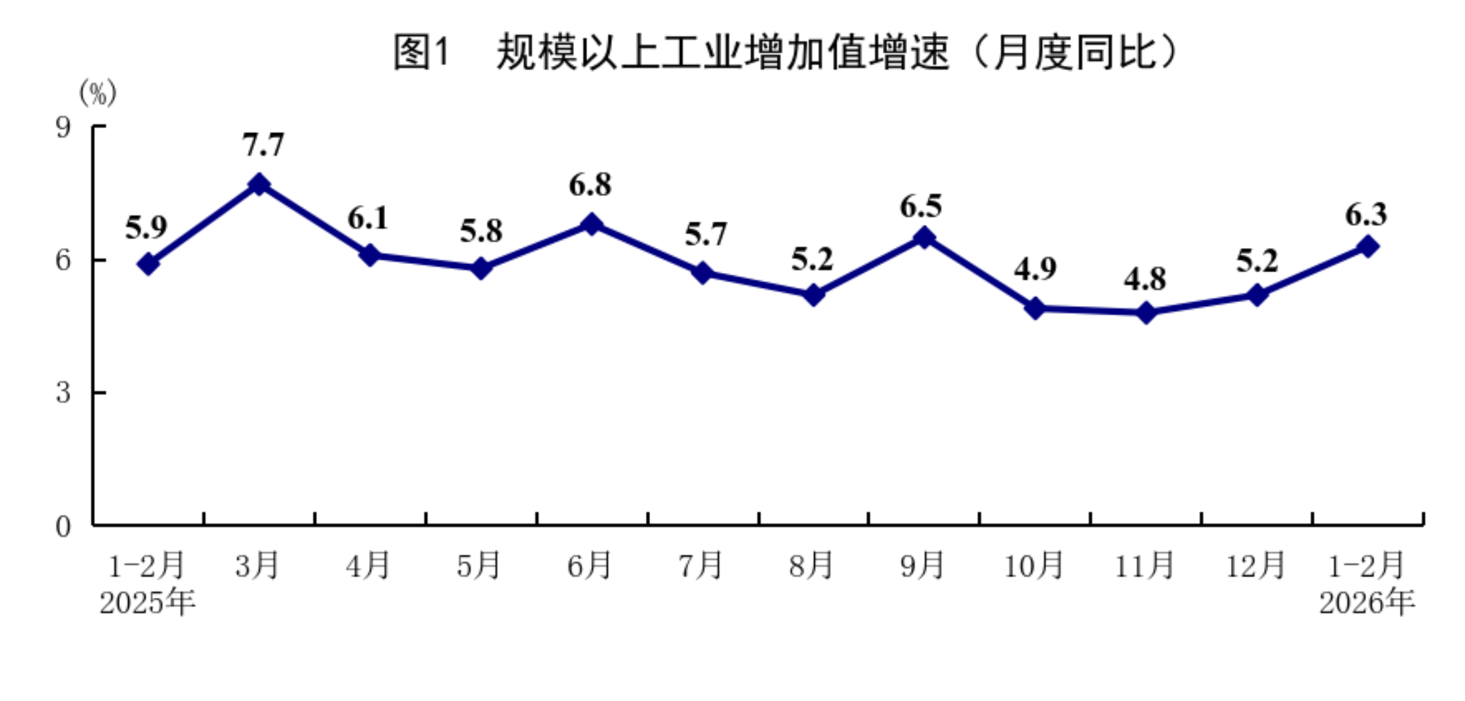 1—2月份,全國規(guī)模以上工業(yè)增加值同比增長6.3%,比上年12月份加快1.1個百分點。分三大門類看,采礦業(yè)增加值同比增長6.1%,制造業(yè)增長6.6%,電力、熱力、燃?xì)饧八a(chǎn)和供應(yīng)業(yè)增長4.7%。裝備制造業(yè)增加值同比增長9.3%,高技術(shù)制造業(yè)增加值增長13.1%,分別快于全部規(guī)模以上工業(yè)增加值3.0和6.8個百分點。分經(jīng)濟(jì)類型看,國有控股企業(yè)增加值同比增長4.2%;股份制企業(yè)增長6.9%,外商及港澳臺投資企業(yè)增長4.0%;私營企業(yè)增長7.4%。分產(chǎn)品看,3D打印設(shè)備、鋰離子電池、工業(yè)機(jī)器人產(chǎn)品產(chǎn)量同比分別增長54.1%、42.6%、31.1%。從環(huán)比看,2月份規(guī)模以上工業(yè)增加值比上月增長0.83%。2月份,制造業(yè)采購經(jīng)理指數(shù)為49.0%;企業(yè)生產(chǎn)經(jīng)營活動預(yù)期指數(shù)為53.2%,比上月上升0.6個百分點。