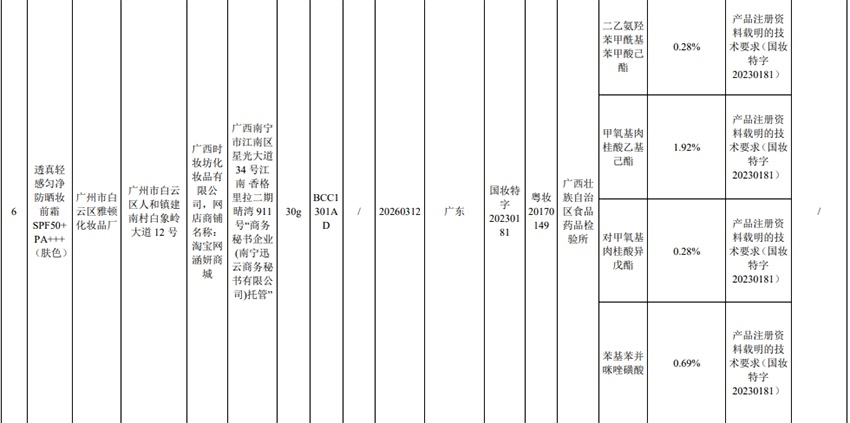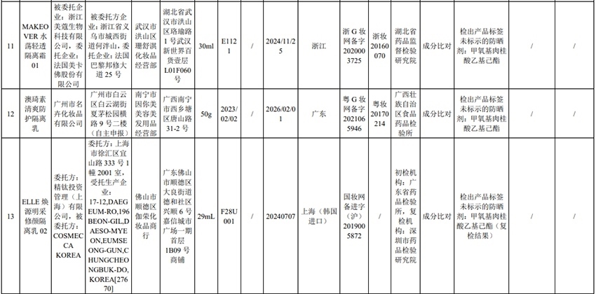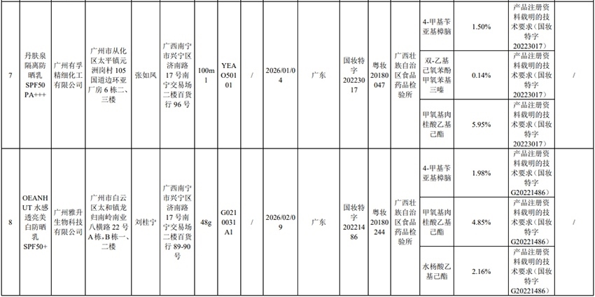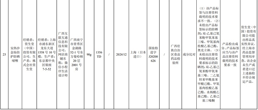 記者注意到,其中,產(chǎn)品標(biāo)簽標(biāo)示為歐萊雅(中國)有限公司生產(chǎn)的蘭蔻輕透水漾防曬乳(標(biāo)示批號:78W200)“未檢出產(chǎn)品標(biāo)簽及注冊資料載明的技術(shù)要求標(biāo)示的防曬劑”;產(chǎn)品標(biāo)簽標(biāo)示為朋友(上海)化妝品銷售有限公司進(jìn)口的普柔瑪絲特染發(fā)膏(配合普蓉斯綈雙氧乳)(標(biāo)示批號:7X15)“檢出產(chǎn)品標(biāo)簽及注冊資料載明的技術(shù)要求未標(biāo)示的染發(fā)劑”;產(chǎn)品標(biāo)簽標(biāo)示為資生堂(中國)投資有限公司經(jīng)銷的安熱沙金燦倍護(hù)防曬啫喱(標(biāo)示批號:1356TD)“產(chǎn)品標(biāo)簽與注冊資料載明的技術(shù)要求不一致”、“未檢出產(chǎn)品標(biāo)簽標(biāo)示的防曬劑”、“未檢出注冊資料載明的技術(shù)要求標(biāo)示的防曬劑”。