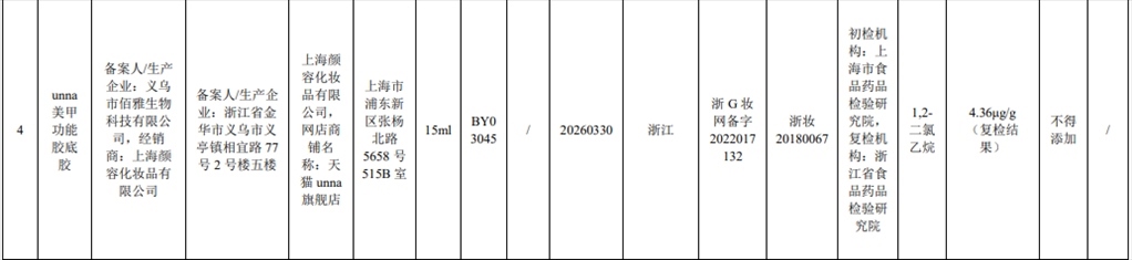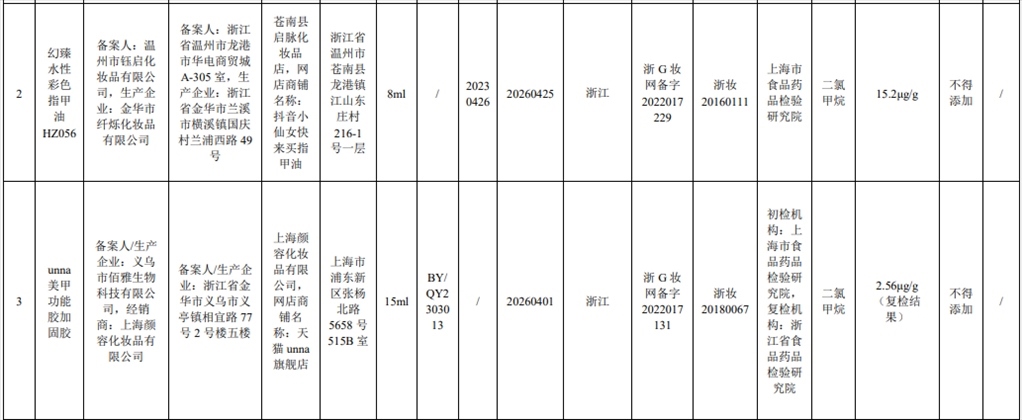 根據(jù)通告,在2023年國家化妝品抽樣檢驗工作中,經(jīng)上海市食品藥品檢驗研究院等單位檢驗,產(chǎn)品標(biāo)簽標(biāo)示委托方為溫州市鈺啟化妝品有限公司、受托生產(chǎn)企業(yè)為金華市纖爍化妝品有限公司生產(chǎn)的幻臻水性彩色指甲油HZ088等7批次化妝品不符合規(guī)定,檢出《化妝品安全技術(shù)規(guī)范(2015年版)》中規(guī)定的禁用原料。