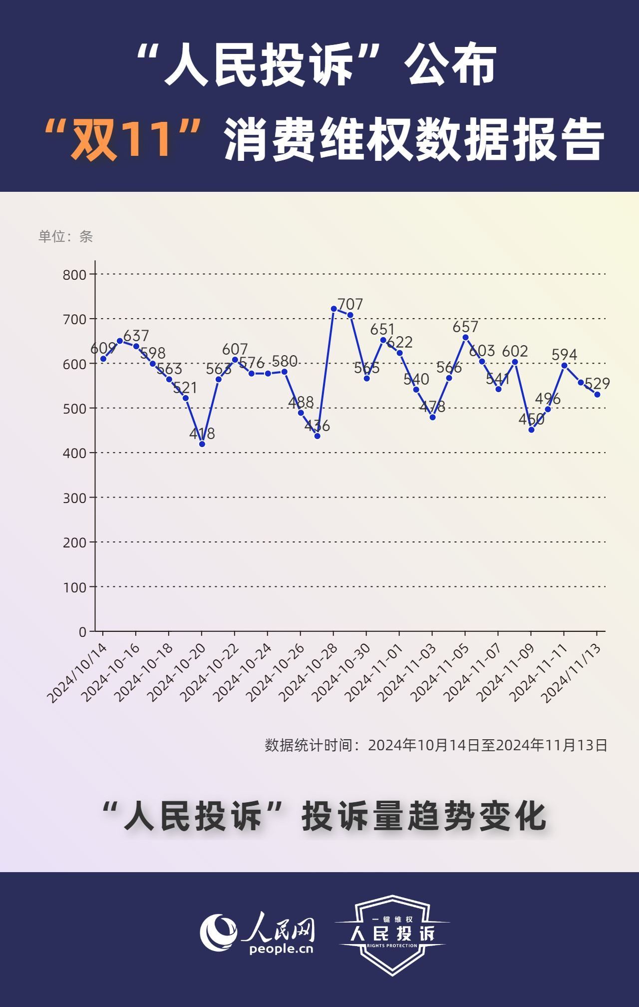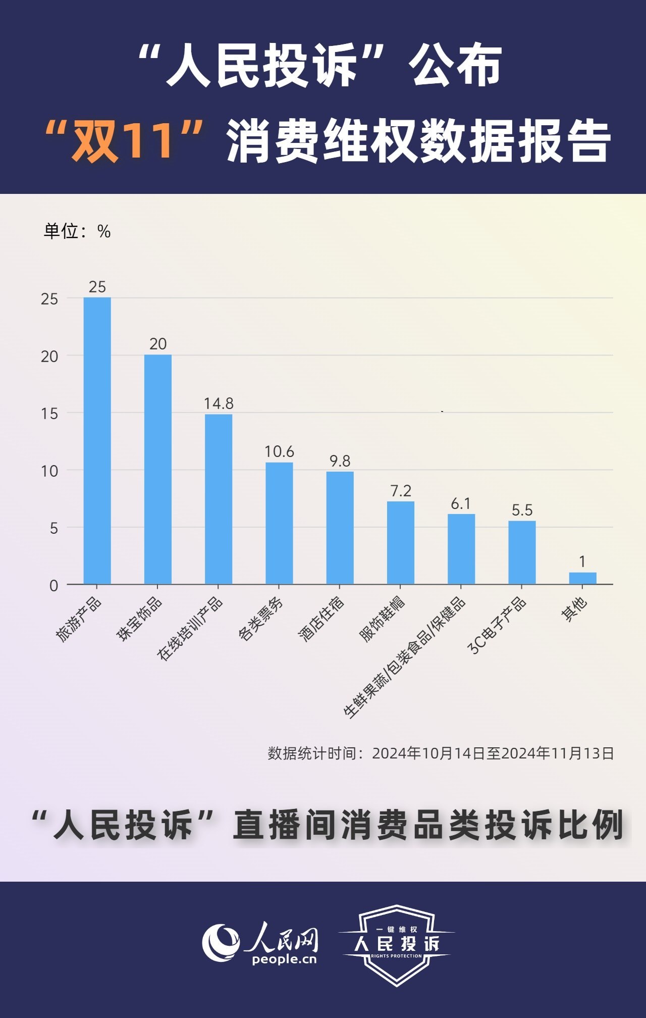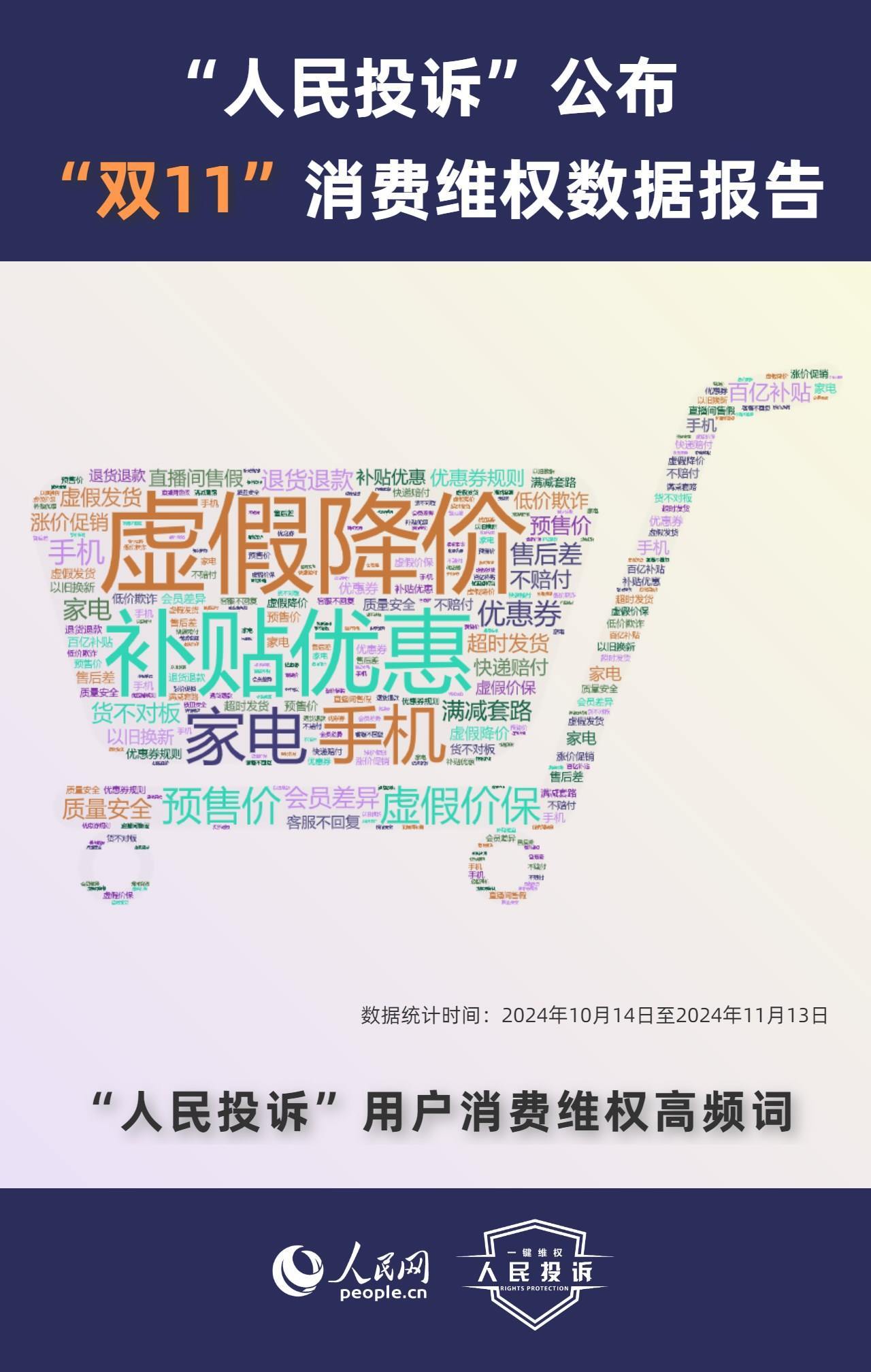 那么,今年你的“雙11”購物還遇到了哪些“套路”?據(jù)人民網(wǎng)“人民投訴”平臺統(tǒng)計,“雙11”期間平臺共收到17699條(數(shù)據(jù)統(tǒng)計從2024年10月14日-11月13日)投訴信息。其中,手機、家電、智能產(chǎn)品、美妝服飾等消費領(lǐng)域維權(quán)量大;平臺“國補”“以舊換新”等優(yōu)惠規(guī)則不透明,保價服務(wù)藏“貓膩”,直播間虛假“破價”,“百億補貼”商品貨不對板,“高價預(yù)售”欺詐等問題反映突出。