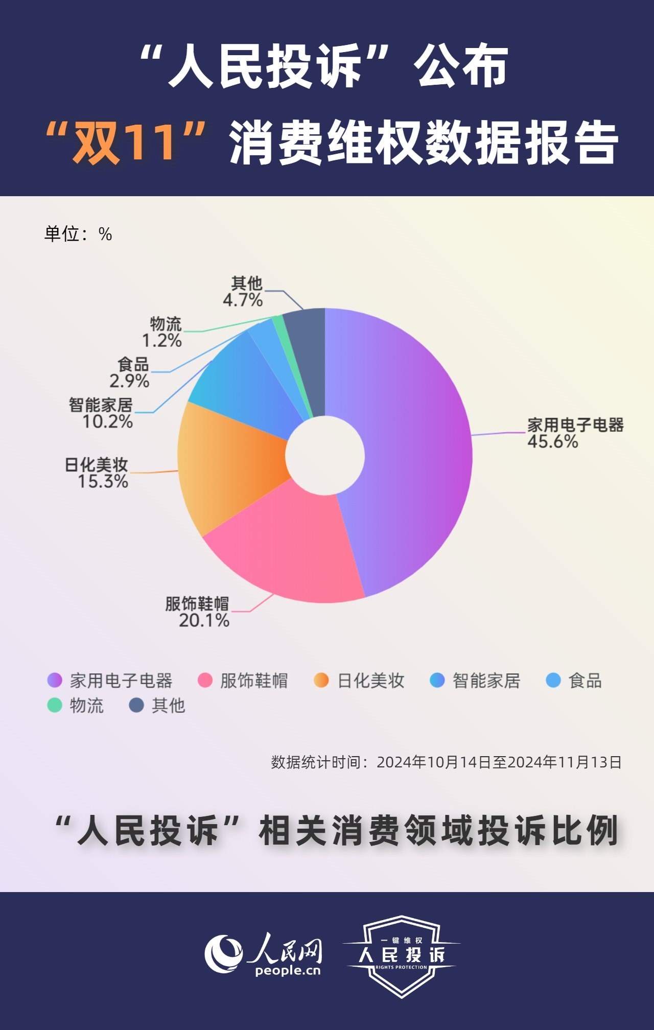 今年“雙11”期間,“人民投訴”主要消費品類的投訴量占比:家用電子電器類(45.6%)、服飾鞋帽類(20.1%)、日化美妝類(15.3%)領(lǐng)域問題較多,其余依次為食品(2.9%)、物流(1.2%)等。從消費渠道看,涉?zhèn)鹘y(tǒng)電商平臺的投訴占比為30.6%、直播間為17.8%。