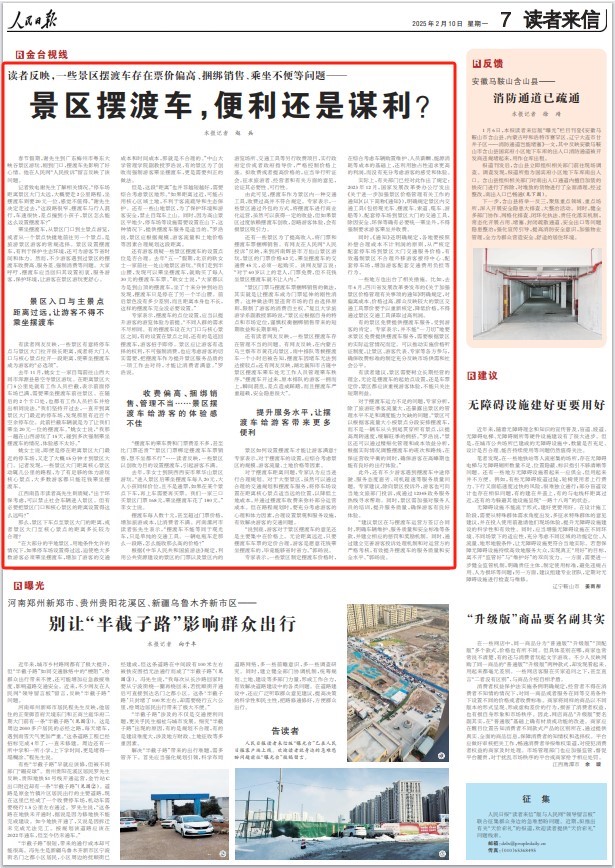 “擺渡車的乘車費(fèi)和門(mén)票費(fèi)差不多,甚至比門(mén)票還貴”“景區(qū)門(mén)票綁定擺渡車車票銷售,想不坐都不行”……讀者反映,一些景區(qū)以創(chuàng)收為目的設(shè)置擺渡車,引起游客不滿。