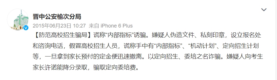 每年各省市投檔分數(shù)線公布后,總是“幾家歡喜幾家愁”,不法分子也在此刻瞄準了落榜考生。根據(jù)各地公安部門通報,一些不法分子假冒高校招生人員或聲稱“熟悉”高校招生辦,點對點與相關(guān)考生取得聯(lián)系。隨后謊稱有某高校的“內(nèi)部指標”“機動計劃”,或是以“定向招生”“委培招生”等名義“降分錄取”考生,誘騙其繳納相關(guān)費用。需要注意的是,在實施這些詐騙行為時,不法分子往往使用電腦合成技術(shù)偽造“招生文件”“學校公章”等,騙取考生及家長的信任。