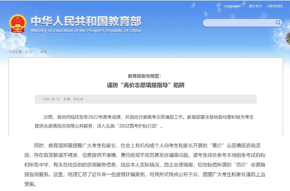 近日,教育部發(fā)布預警,提醒考生謹防“高價志愿填報指導”陷阱。有網(wǎng)站虛假宣傳擁有所謂“內(nèi)部信息”,自稱掌握內(nèi)部大數(shù)據(jù),能夠“精準定位院?!钡鹊?。事實上,每年高考填報志愿前,各省級招生考試機構(gòu)都會發(fā)布當年高考成績統(tǒng)計情況和近年來各高校錄取分數(shù)情況,并不存在市面上的咨詢機構(gòu)或個人聲稱的“內(nèi)部信息”。還有一些咨詢機構(gòu)假冒所謂志愿填報專家身份。該咨詢機構(gòu)打出廣告,稱團隊的專家“獲得高考志愿規(guī)劃師認證”“來自著名高校”等。事實上,有關(guān)部門從未發(fā)放過“高考志愿規(guī)劃師”這類職業(yè)資格證書。該機構(gòu)一些所謂“志愿規(guī)劃師”都是臨時招募的社會人員,按照總部提供的“臺詞”給考生和家長輔導。家長購買這些機構(gòu)的服務(wù)不僅花了冤枉錢,而且可能報錯志愿。
