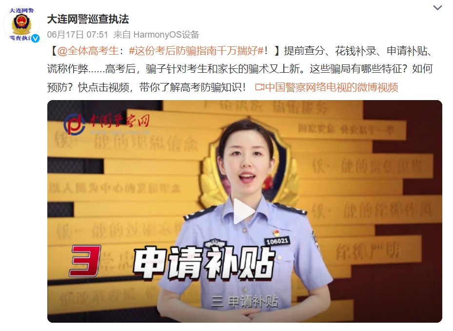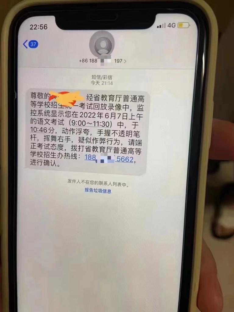 “尊敬的考生×××,經(jīng)省教育廳普通高等學校招生統(tǒng)一考試回放錄像中,監(jiān)控系統(tǒng)顯示您在2022年6月7日上午的語文考試(9:00—11:30)中,于10時46分,動作浮夸,手握不透明筆桿,揮舞右手,疑似作弊行為,請端正考試態(tài)度,撥打省教育廳普通高等學校招生辦熱線:188×××進行確認?!苯眨锌忌驈B門警方反映,自己接到了聲稱是“省教育廳普通高等學校招生辦”的通知短信,懷疑是詐騙信息。該短信在開頭準確寫明了考生姓名,并在結(jié)尾要求考生主動撥電話號碼進行確認。經(jīng)與教育部門核實確認,高考作弊違規(guī)行為不會以短信、電話、鏈接等方式通知。廈門警方提醒,不法分子通過非正常渠道搜集到考生信息,并向考生發(fā)送所謂“疑似作弊”的通知短信,考生一旦回撥電話,就可能被不法分子以“處理作弊行為”為由實施詐騙。