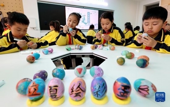 5月5日,在山東省棗莊市東湖小學(xué),學(xué)生們?cè)诶L制彩蛋。