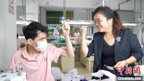 圖為李王花與殘疾員工互道“加油”。 陳英清 攝
