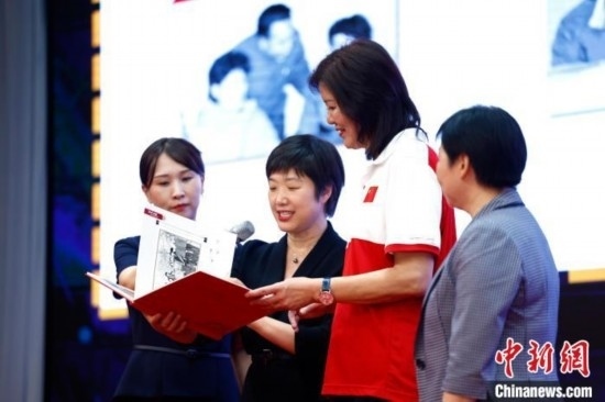 圖為郎平向陳經(jīng)綸中學(xué)贈送紀(jì)念品。中新社記者 富田 攝