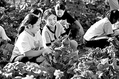 河北省樂(lè)亭縣新寨鎮(zhèn)蘭坨小學(xué)學(xué)生在“校園農(nóng)場(chǎng)”收獲蘿卜。新華社發(fā)