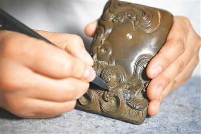 僅燒制出來就完美了嗎?還遠遠不夠。藺霄麟覺得,這些硯臺的造型上還缺點什么。待剩下的工序全部打磨完后,他把自己關進了屋子,拿出一方得之不易的豆沙綠硯臺開始磨新造型?!罢f實話,每磨一次我的心都在顫抖,硯臺隨時都可能破裂?!?/P>