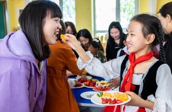 2023年5月12日,呼和浩特市玉泉區(qū)五塔寺東街小學(xué)學(xué)生請(qǐng)媽媽品嘗自己剛剛拼好的水果拼盤。通訊員 丁根厚 攝