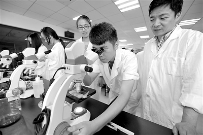 杭州職業(yè)技術(shù)學(xué)院生物制藥專業(yè)客座教授、杭州市首席技師章飛龍(右一)正在指導(dǎo)學(xué)生實訓(xùn)。