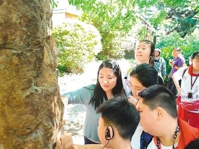 崔碩(左一)給參加研學(xué)活動(dòng)的孩子講解硅化木的形成。受訪者供圖