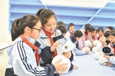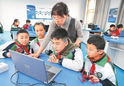 江西省上饒市廣豐區(qū)洋口中心小學(xué)人工智能教室里,學(xué)生們?cè)诶蠋煹闹笇?dǎo)下開展人工智能科普課程。朱文標(biāo)攝(人民圖片)