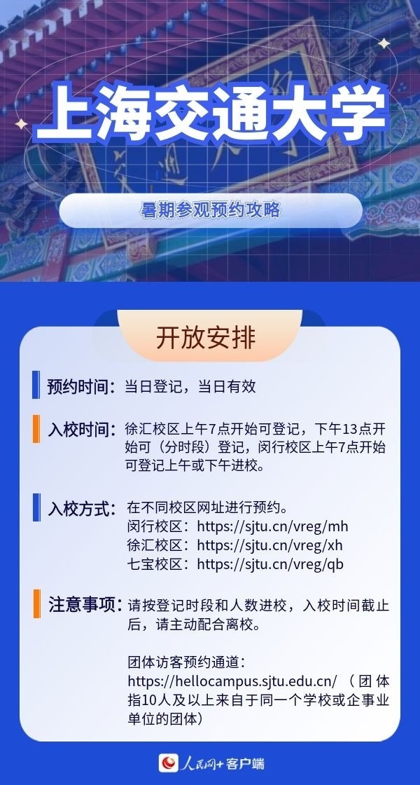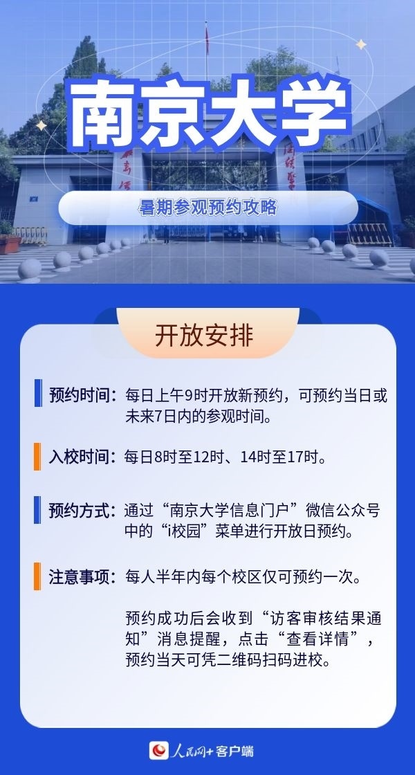 人民網(wǎng)北京7月19日電 暑假來臨,帶孩子參觀高校,感受學(xué)校人文歷史底蘊以及濃厚的學(xué)術(shù)氛圍,已經(jīng)成為很多家長的選擇。近日,全國多所高校開放校園,接受公眾參觀。那么如何預(yù)約進校?有什么注意事項?人民網(wǎng)特別整理了部分高校的參觀預(yù)約攻略,一起來看。(郝孟佳、實習(xí)生趙雪祺)