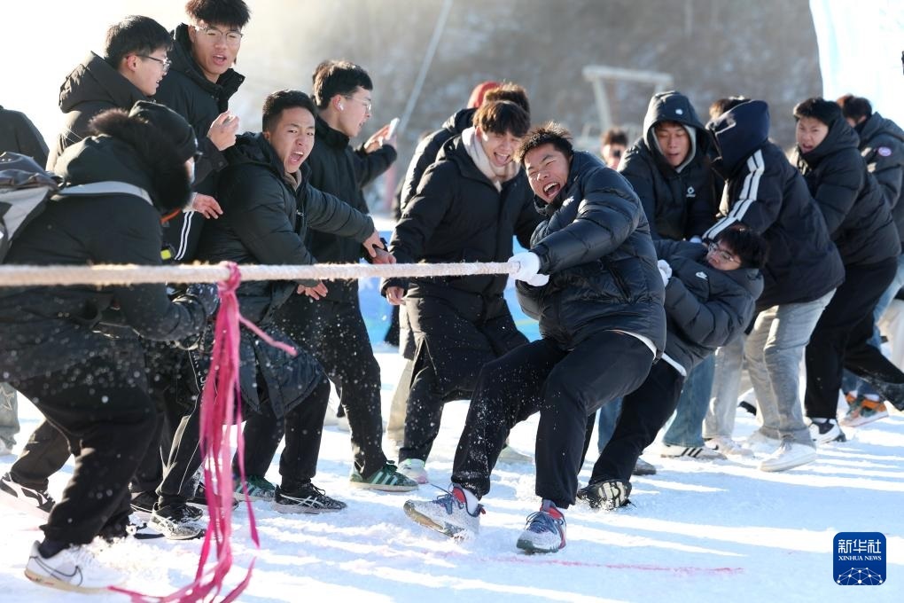 12月21日,在河北省石家莊市鹿泉區(qū)冰雪小鎮(zhèn),大學(xué)生進(jìn)行雪地拔河比賽。