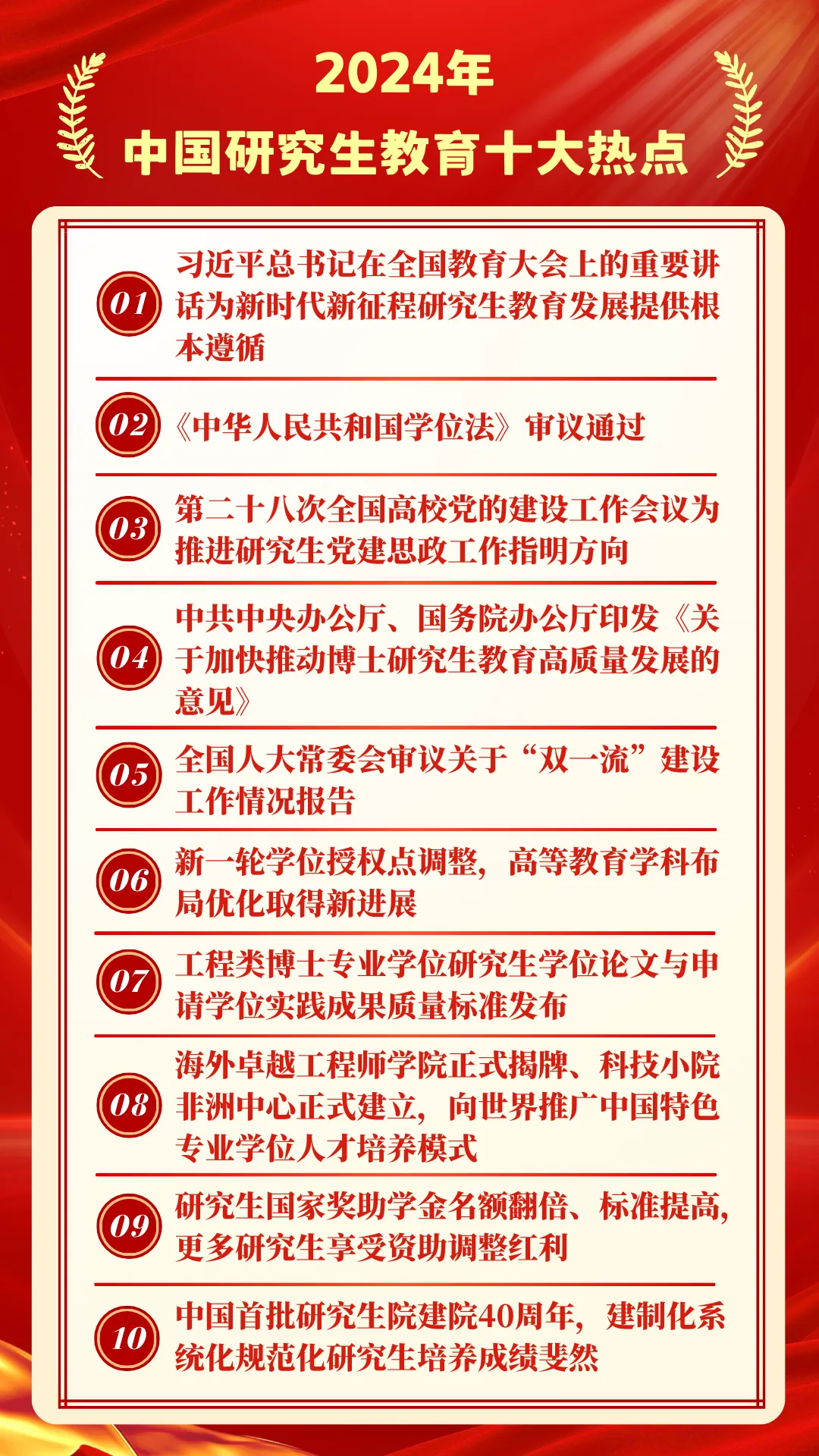 2024年,是中國學(xué)位與研究生教育發(fā)展史上具有重要里程碑意義的一年,在教育部學(xué)位管理與研究生教育司指導(dǎo)下,教育部學(xué)位與研究生教育發(fā)展中心《中國研究生》雜志回顧總結(jié)全年研究生教育大事要事和熱點(diǎn)動態(tài),聯(lián)合人民網(wǎng)、新華網(wǎng)、中國教育報和有關(guān)研究生教育媒體等共同發(fā)布2024年中國研究生教育十大熱點(diǎn)。