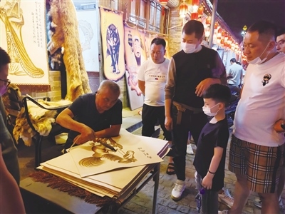 在老街上一些具有民族特色的皮畫店、皮包店也成為了人們駐足消費(fèi)、觀賞的熱點(diǎn)商鋪。在一家皮畫店,皮畫師在現(xiàn)場制作皮畫,看著精美的圖案被皮畫師一筆一筆地勾勒出來,不少市民都忍不住停下腳步?!皫Ш⒆映鰜黹e逛,看到皮畫孩子主動提出來要看,皮畫是咱們呼市特有的,現(xiàn)場制作,能讓更多人了解制作過程,了解皮畫,挺好的。”市民周先生說。