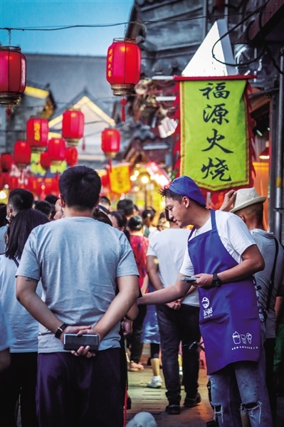 6月7日正值周日,夜幕還未降臨,大召廣場上已經(jīng)聚集了不少消遣的市民,他們當(dāng)中有六七十歲的老人,也有二三十歲的青年,還有牽著父母手的孩童。隨著時(shí)間的推移,廣場上的人越來越多,而緊挨著廣場的通順大巷更是人頭攢動,吆喝聲、叫賣聲、談笑聲、音樂聲混在一起,形成了夏季獨(dú)有的市井之聲。街上,從本地的稀果羹、羊肉串、烤面筋到北京爆肚、武漢臭豆腐可謂應(yīng)有盡有,家家戶戶的門前都或多或少的有市民排隊(duì)等候。