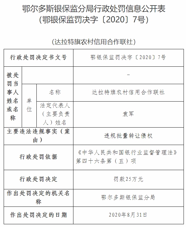 內(nèi)蒙古這家信用聯(lián)社違規(guī)批量轉(zhuǎn)讓債權(quán)被罰25萬元