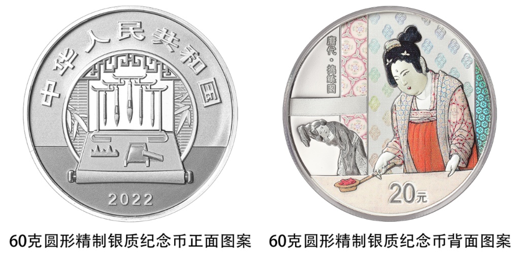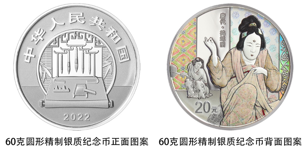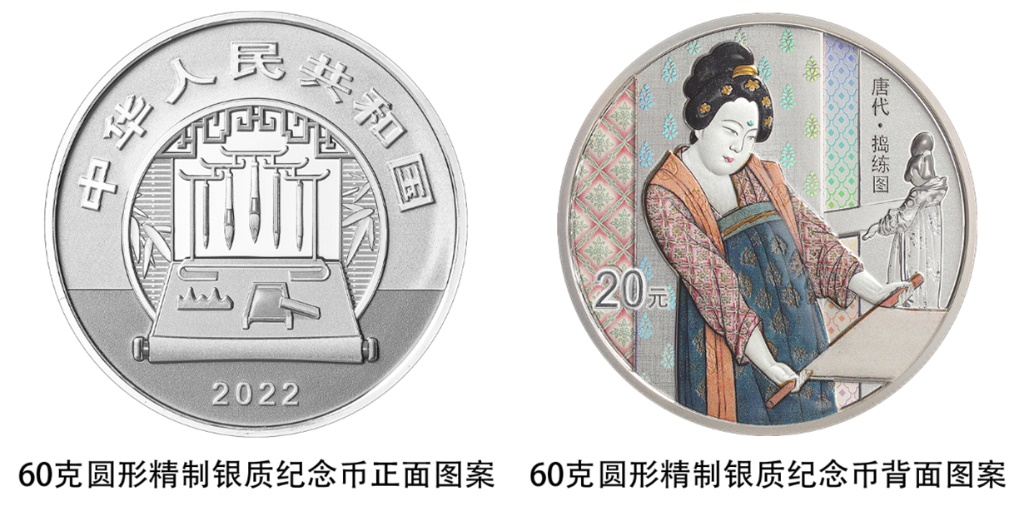 一枚60克圓形銀質(zhì)紀(jì)念幣背面圖案為《搗練圖》中熨燙、嬉戲造型,襯以裝飾紋樣組合設(shè)計(jì),并刊“唐代·搗練圖”字樣及面額。