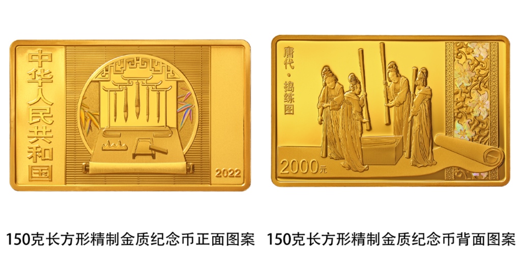 該套金銀紀(jì)念幣正面圖案均為筆、墨、紙、硯造型,輔以竹葉、窗等裝飾組合設(shè)計(jì),背面圖案則各有特色。一枚150克長(zhǎng)方形金質(zhì)紀(jì)念幣背面圖案為《搗練圖》中搗練場(chǎng)景,襯以裝飾紋樣組合設(shè)計(jì),并刊“唐代·搗練圖”字樣及面額。