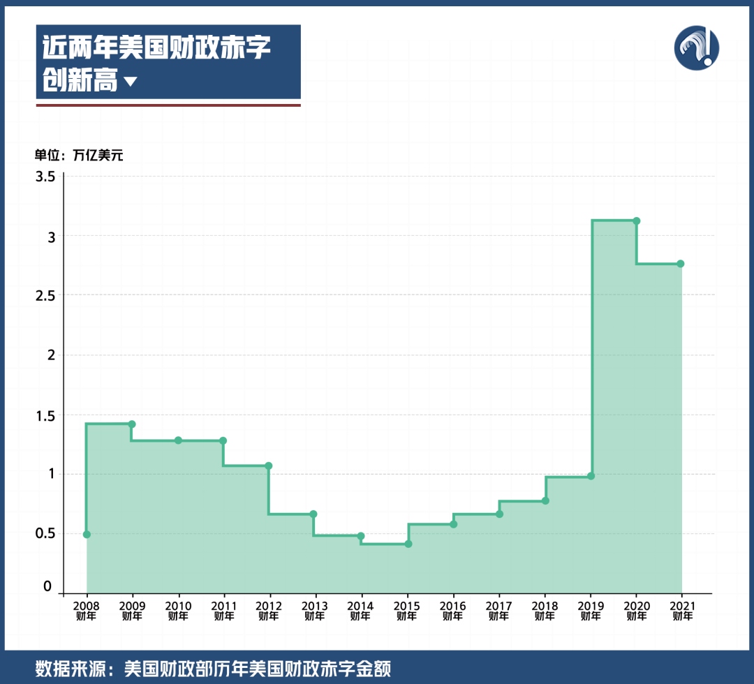 不僅如此,美國(guó)還多次出臺(tái)大規(guī)模經(jīng)濟(jì)紓困法案,2021年財(cái)政赤字率達(dá)到了12.4%,甚至已經(jīng)高于2009年金融危機(jī)期間9.8%的歷史最高水平。