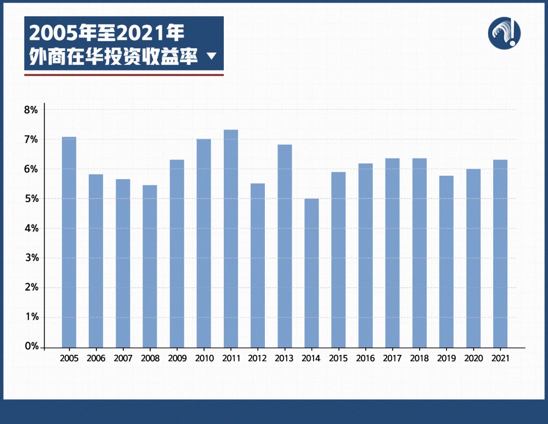 即便在新冠肺炎疫情期間,外商在華投資總體收益率依然在上升。2021年,外國(guó)投資者在中國(guó)投資,仍然能獲得超6%的收益率。