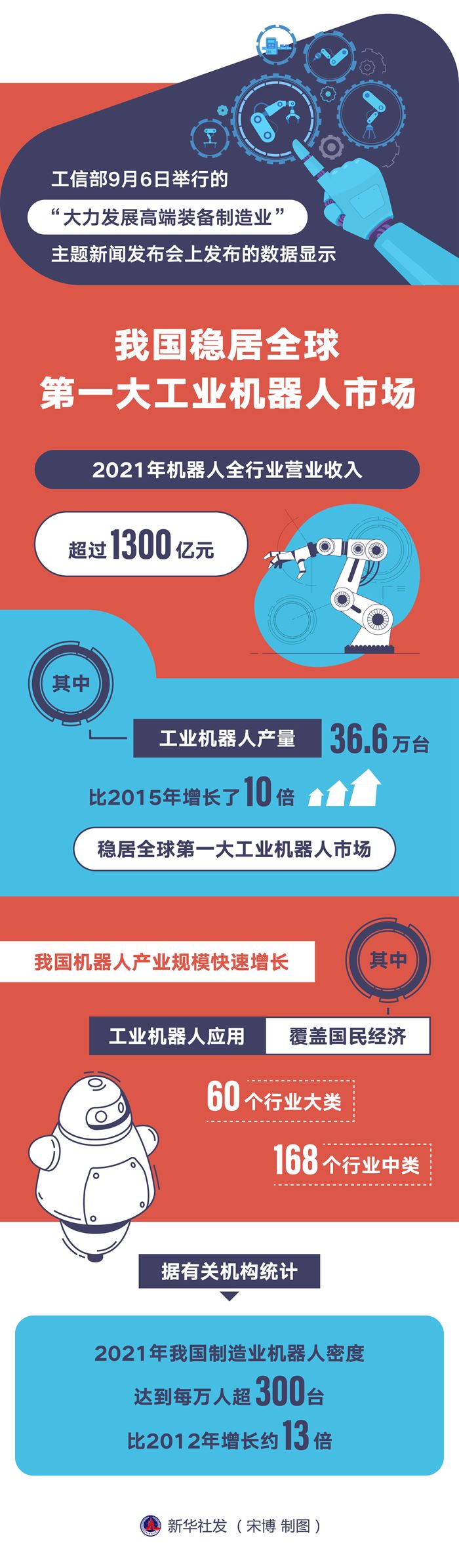 工信部裝備工業(yè)一司副司長郭守剛6日表示,我國機器人產業(yè)規(guī)模快速增長,2021年機器人全行業(yè)營業(yè)收入超過1300億元。其中,工業(yè)機器人產量達36.6萬臺,比2015年增長了10倍,穩(wěn)居全球第一大工業(yè)機器人市場。