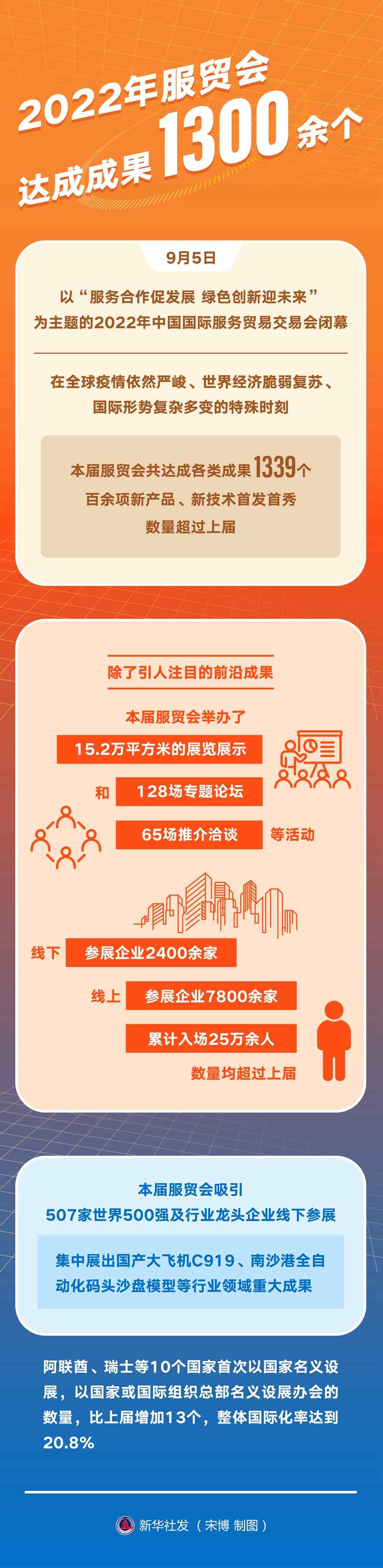 9月5日,以“服務(wù)合作促發(fā)展綠色創(chuàng)新迎未來”為主題的2022年中國國際服務(wù)貿(mào)易交易會閉幕。在全球疫情依然嚴(yán)峻、世界經(jīng)濟(jì)脆弱復(fù)蘇、國際形勢復(fù)雜多變的特殊時刻,本屆服貿(mào)會共達(dá)成各類成果1339個,百余項新產(chǎn)品、新技術(shù)首發(fā)首秀,數(shù)量超過上屆。
