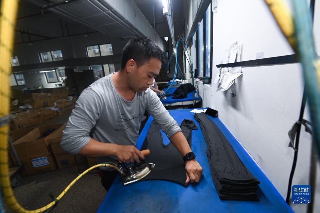 10月27日,在浙江省諸暨市大唐街道的一家企業(yè)車間內(nèi),工人在熨燙保暖褲襪。新華社記者 徐昱 攝