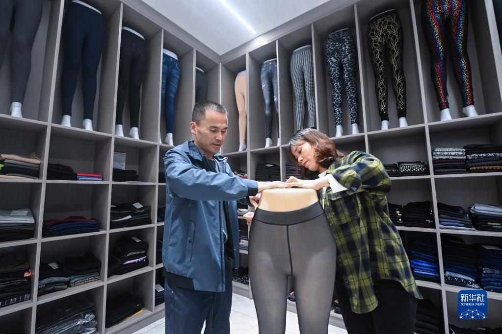 10月27日,在浙江省諸暨市大唐街道的一家專業(yè)生產(chǎn)拉絨打底褲產(chǎn)品的企業(yè)展廳內(nèi),工作人員給展示道具套上一款拉絨打底褲。新華社記者 徐昱 攝