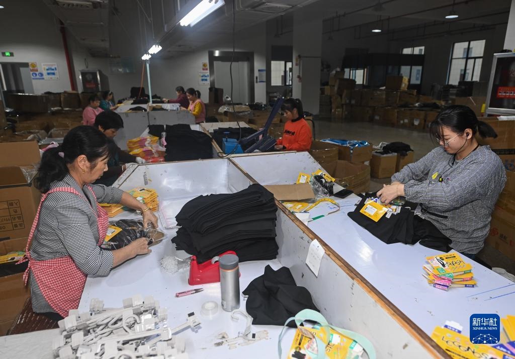 10月27日,在浙江省諸暨市大唐街道的一家企業(yè)車間內(nèi),工人在包裝保暖褲襪。新華社記者 徐昱 攝