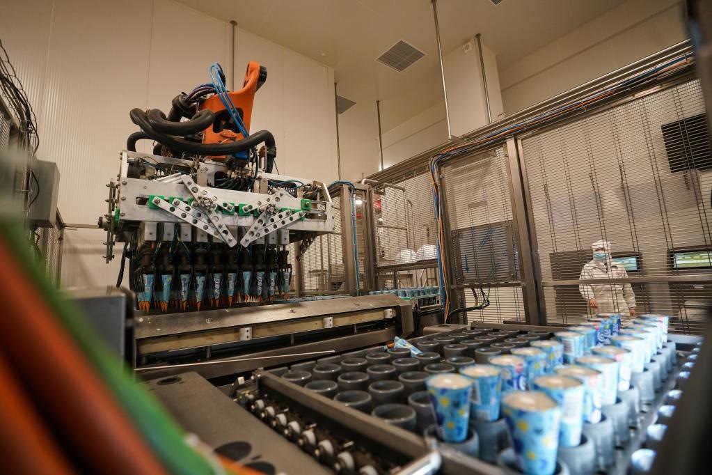 位于江蘇蘇州太倉的聯(lián)合利華和路雪生產(chǎn)基地,于2021年9月獲評全球“燈塔工廠”,成為當?shù)亍爸悄苤圃臁钡臉藯U。工廠里,機器人正將產(chǎn)品轉移到速凍隧道。新華社記者 季春鵬 攝