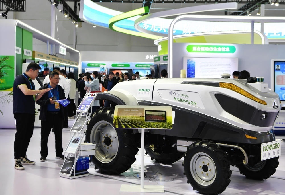在第六屆數(shù)字中國(guó)建設(shè)峰會(huì)智慧農(nóng)業(yè)展廳展出的新能源無人駕駛智能拖拉機(jī)吸引參觀者駐足觀看(4月26日攝)。新華社記者 魏培全 攝