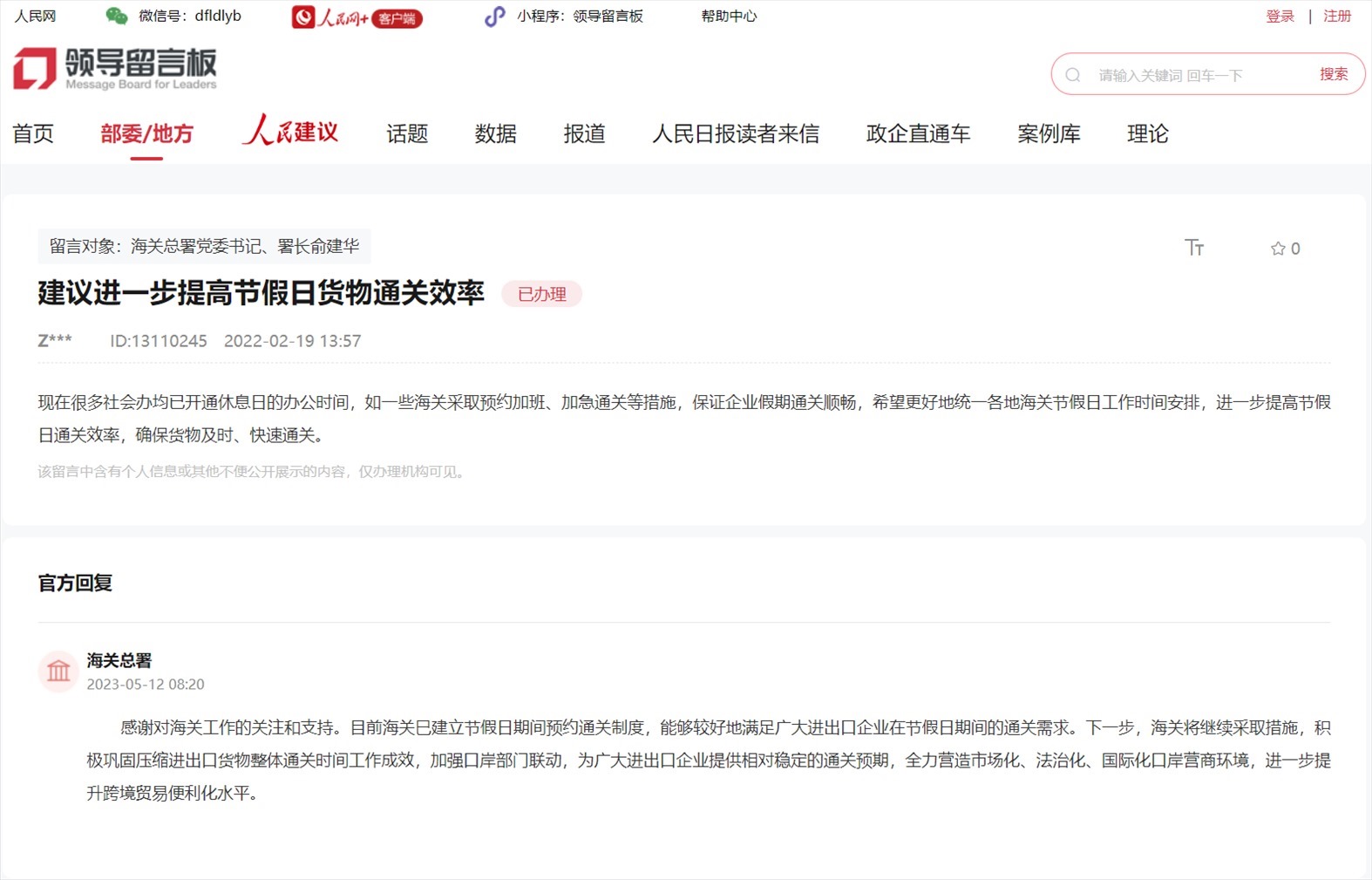近日,網(wǎng)友通過人民網(wǎng)“領(lǐng)導(dǎo)留言板”對全國海關(guān)積極建言獻(xiàn)策,包括外來物種入侵、進(jìn)一步提高節(jié)假日貨物通關(guān)效率等方面。