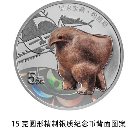 15克圓形銀質紀念幣背面圖案為陶鷹鼎造型,襯以仰韶文化相關紋飾,并刊“國家寶藏·陶鷹鼎”字樣及面額。