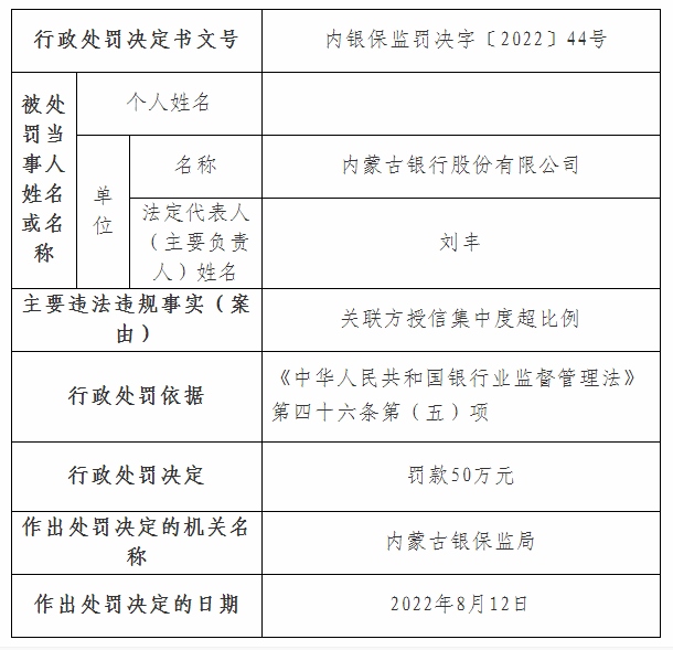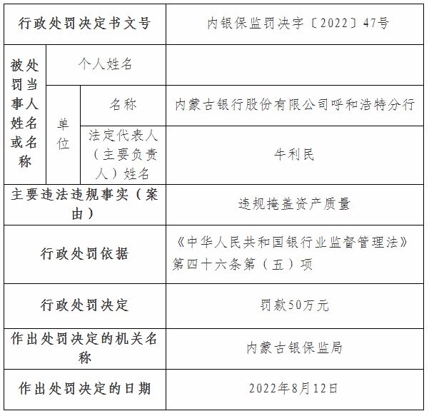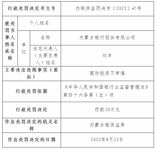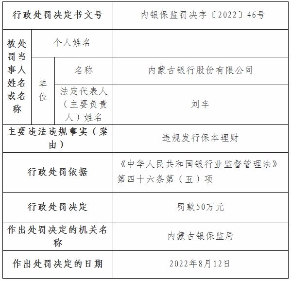 其中內(nèi)銀保監(jiān)罰決字〔2022〕44號、45號、46號行政處罰信息公開表顯示,內(nèi)蒙古銀行因關(guān)聯(lián)方授信集中度超比例、理財投資不審慎、違規(guī)發(fā)行保本理財,分別被罰款50萬元、30萬元、50萬元;內(nèi)銀保監(jiān)罰決字〔2022〕47號行政處罰信息公開表顯示,內(nèi)蒙古銀行呼和浩特分行違規(guī)掩蓋資產(chǎn)質(zhì)量,被罰款50萬元;內(nèi)銀保監(jiān)罰決字〔2022〕48號行政處罰信息公開表顯示,內(nèi)蒙古銀行小企業(yè)金融服務(wù)中心因違規(guī)轉(zhuǎn)嫁成本,被罰款330萬元。
