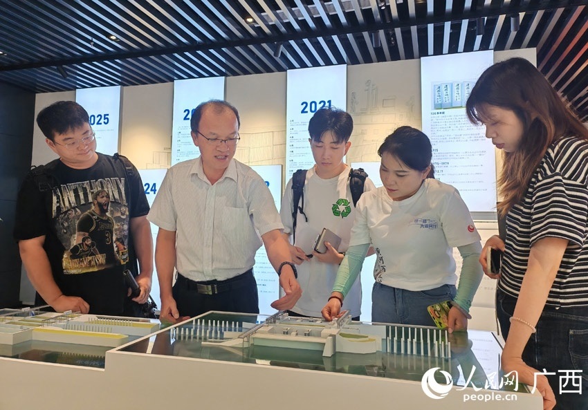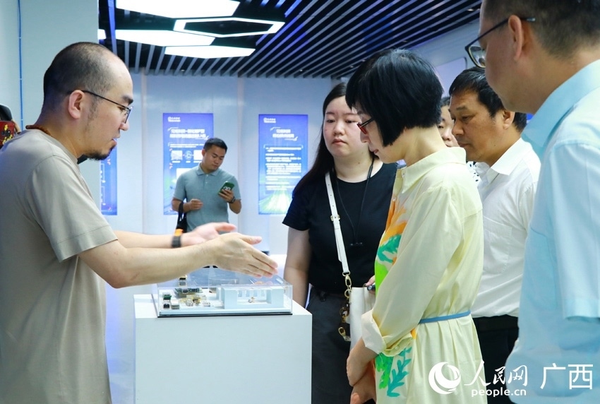 采訪團在西部陸海新通道南寧國際鐵路港展廳內采訪。人民網 嚴立政攝