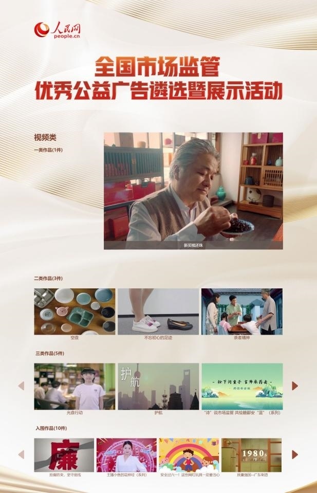 人民網(wǎng)北京12月17日電 (記者許維娜)公益廣告是弘揚社會主義核心價值觀的重要載體,也是促進市場監(jiān)管文化建設(shè)的重要力量。15日下午,全國市場監(jiān)管優(yōu)秀公益廣告遴選暨展示活動評審結(jié)果在北京揭曉。此次活動共評選出視頻類和平面類入選作品各19件,其中一類作品各有1件,二類作品各有3件,三類作品各有5件,入圍作品各有10件。