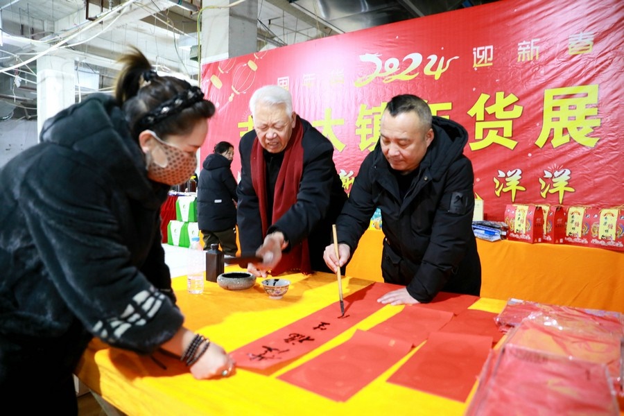 著名書法家柴義現(xiàn)場為市民免費書寫春聯(lián)