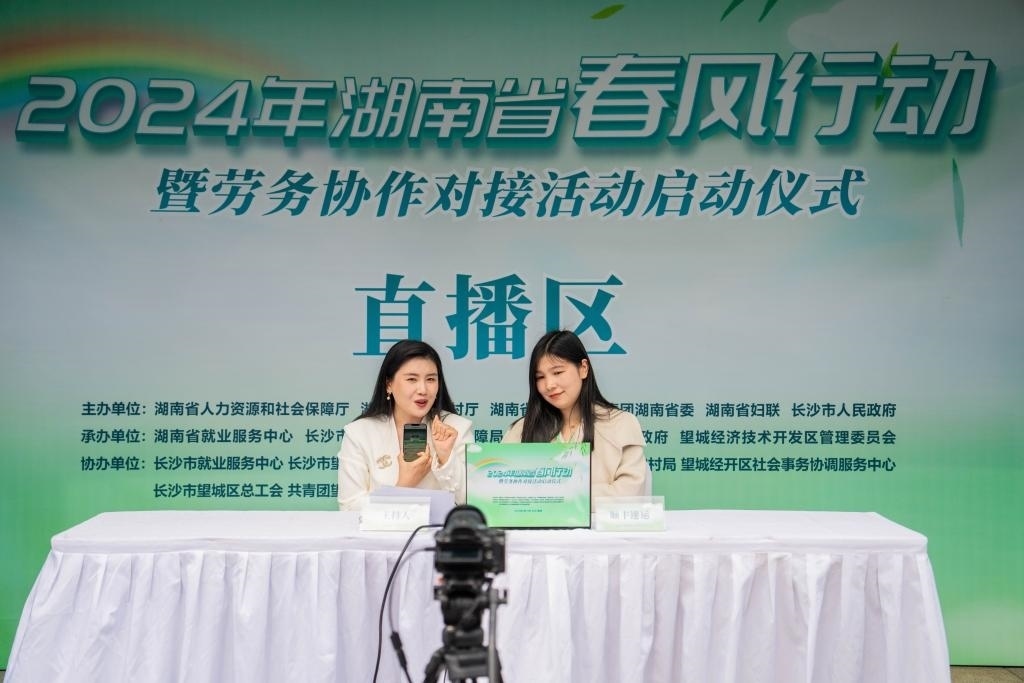 2月19日,在湖南省長(zhǎng)沙市望城區(qū)市民廣場(chǎng),工作人員在“春風(fēng)行動(dòng)”招聘活動(dòng)上通過(guò)網(wǎng)絡(luò)直播推薦工作崗位。新華社記者 陳思汗 攝