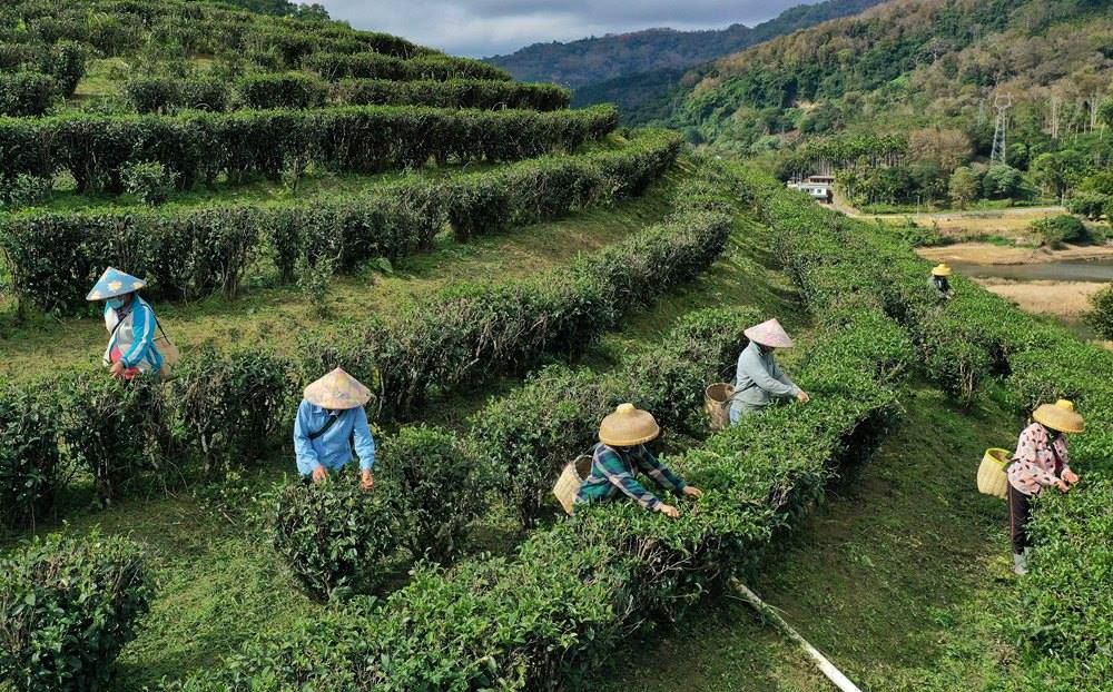 農(nóng)民在五指山椰仙茶園采茶(無人機(jī)照片,2024年1月11日攝)。新華社記者 郭程 攝
