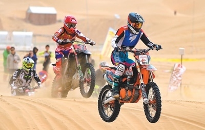 戶外運(yùn)動愛好者在內(nèi)蒙古鄂爾多斯市杭錦旗參加摩托車沙漠越野場地賽。王 正攝(人民視覺)
