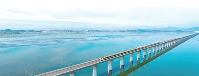試驗列車行駛在湄洲灣跨海大橋上。